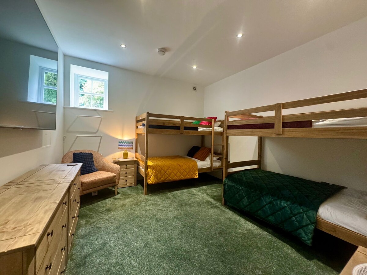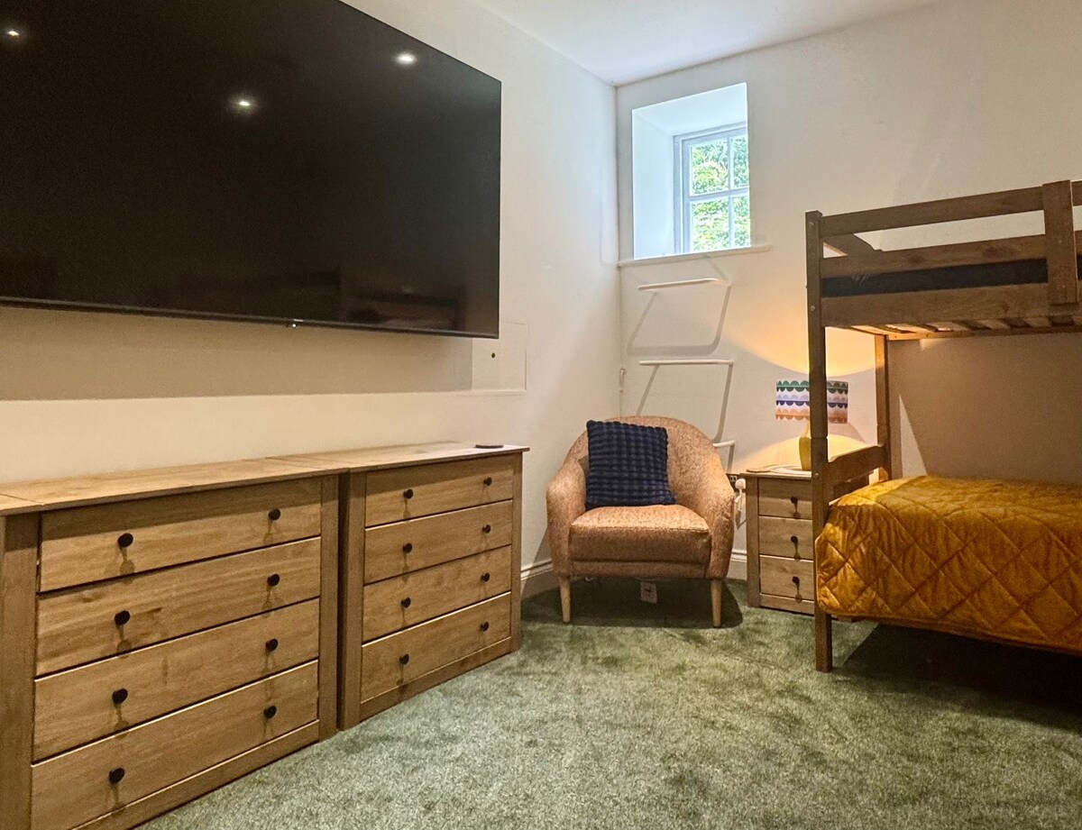 One of the true treasures of Wisteria Lodge lies downstairs: the children’s and teens’ quarters. This dedicated space feels like a secret den, complete with two sturdy bunk beds and a large TV—perfect for movie marathons or gaming sessions. A magical hideaway for younger guests to play, relax, and make memories.